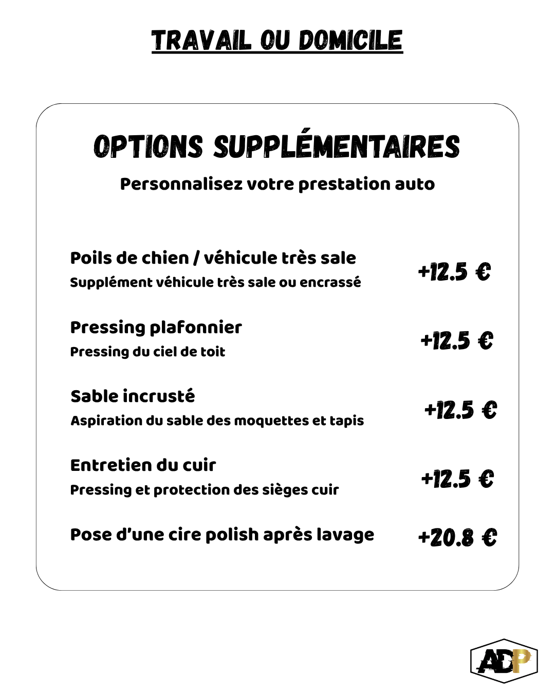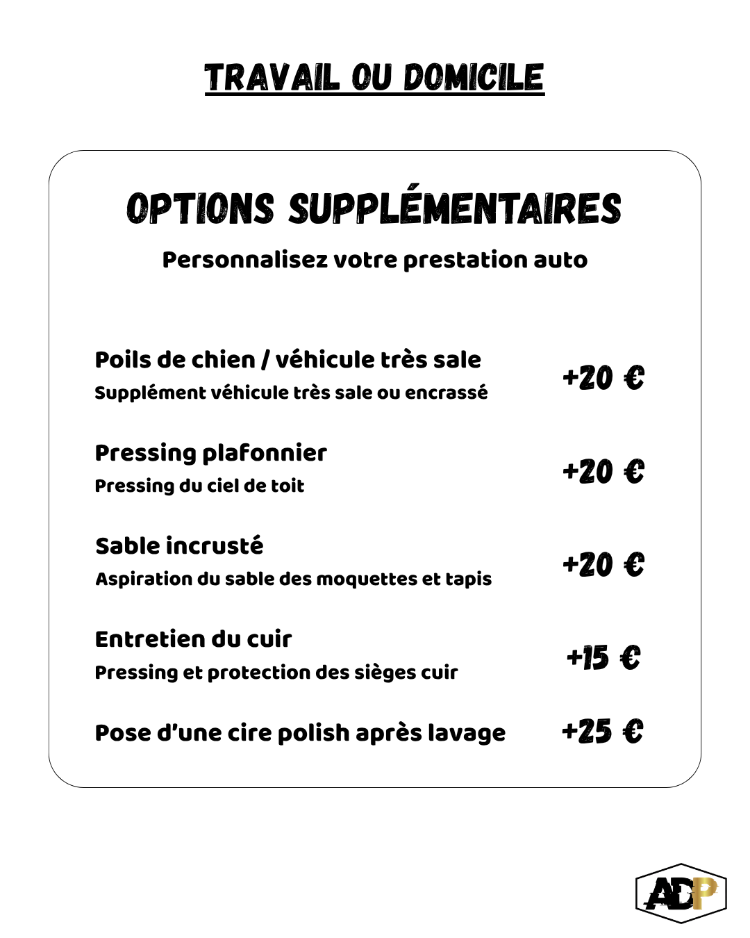 - Supplément en cas de poils d’animaux ou de sable 20€